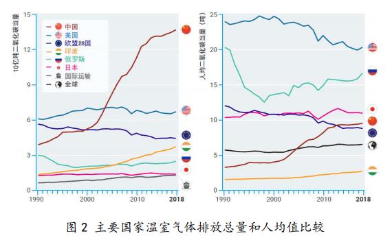 三是實現(xiàn)《巴黎協(xié)定》長期目標仍存在較大差距。如果按照現(xiàn)有 的各國國家自主貢獻的實施力度,到本世紀末,將有 66%的概率把溫 度升幅控制在 3.0℃~3.2℃以內。要實現(xiàn) 2℃的溫控目標,2030 年 的年排放量必須比各國目前實施的國家自主貢獻情景低 150 億噸二 氧化碳當量,要實現(xiàn) 1.5℃的目標,年排放量必須比各國目前實施的 國家自主貢獻情景低 320 億噸二氧化碳當量。 圖 2 主要國家溫室氣體排放總量和人均值比較