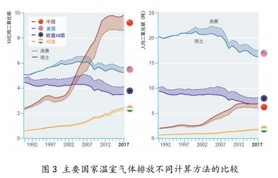 二是本次報告討論了主要排放大國的具體問題,特別是中印等新 興經(jīng)濟體的減排現(xiàn)狀和潛力。以往以多邊機構名義發(fā)布的評估報告, 往往僅針對全球或聯(lián)合國地理區(qū)劃來評估,較少對國別進行專門論述, 特別是氣候變化問題中發(fā)達國家和發(fā)展中國家的區(qū)分界限仍然是敏 感問題。相比于“南北之分”,本次報告更注重“大小之分”,報告放 棄了減排責任分擔的公平性原則,而是采用了無差別化的最低成本路 6 徑作為情景分析的假設。本次報告特別選取了二十國集團作為主要評 估對象,特別對前七大、前四大排放國進行了更為具體的分析,包括 對是否能完成國家自主貢獻的預期判斷、長期減排潛力和力度提高空 間、主要政策途徑等。同時,報告還專門對中國人均排放接近歐盟和 日本提出了特別關切,并對基于領土和消費的不同排放計算方法進行 了比較,如圖 3 所示,認為有差異但不影響主要結論且現(xiàn)有多邊進程 未納入有關消費排放談判的考慮。