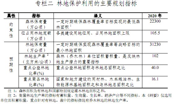 全國林地保護利用規劃綱要 (2010-2020年) 林地是國家重要的自然資源和戰略資源, 是森林賴以生存與發展的根基,在保障木材及林產品供給、維護國土生態安全中具有核心地位,在應對全球氣候變化中具有特殊地位。國務院明確要求“要把林地與耕地放在同等重要的位置,高度重視林地保護” 。為貫徹落實科學發展觀,統籌好林地資源的保護利用,不斷增加森林資源,根據《中華人民共和國森林法》、《中華人民共和國森林法實施條例》 、 《中共中央國務院關于加大統籌城鄉發展力度進一步夯實農業農村發展基礎的若干意見》(中發[2010]1號)和《全國土地利用總體規劃綱要(2006-2020年)》等法律法規和國家有關林地保護管理的方針、政策,制定《全國林地保護利用規劃綱要(2010-2020年)》以下簡稱《綱要》)。 本《綱要》主要闡明規劃期內國家林地保護利用戰略,明確全國林地保護利用的指導思想、目標任務和政策措施,引導全社會嚴格保護林地、節約集約利用林地、優化林地資源配置,提高林地保護利用效率,實現 2020 年森林覆蓋率奮斗目標,實現我國在聯合國氣候變化峰會上提出的爭取到 2020 年森林面積和蓄積分別比2005年增加4000萬公頃和13億立方米的目標。《綱要》是指導全國林地保護利用的綱領性文件。 本《綱要》的規劃范圍未包括香港特別行政區、澳門特別行政區和臺灣省。