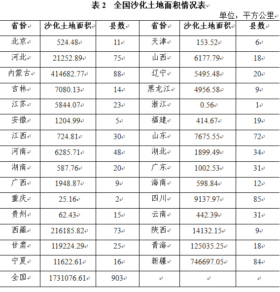 截至2009年底,全國沙化土地面積為173.11萬平方公里,占國土總面積的18.03%。動態情況,2005-2009年五年間年均減少1717平方公里。